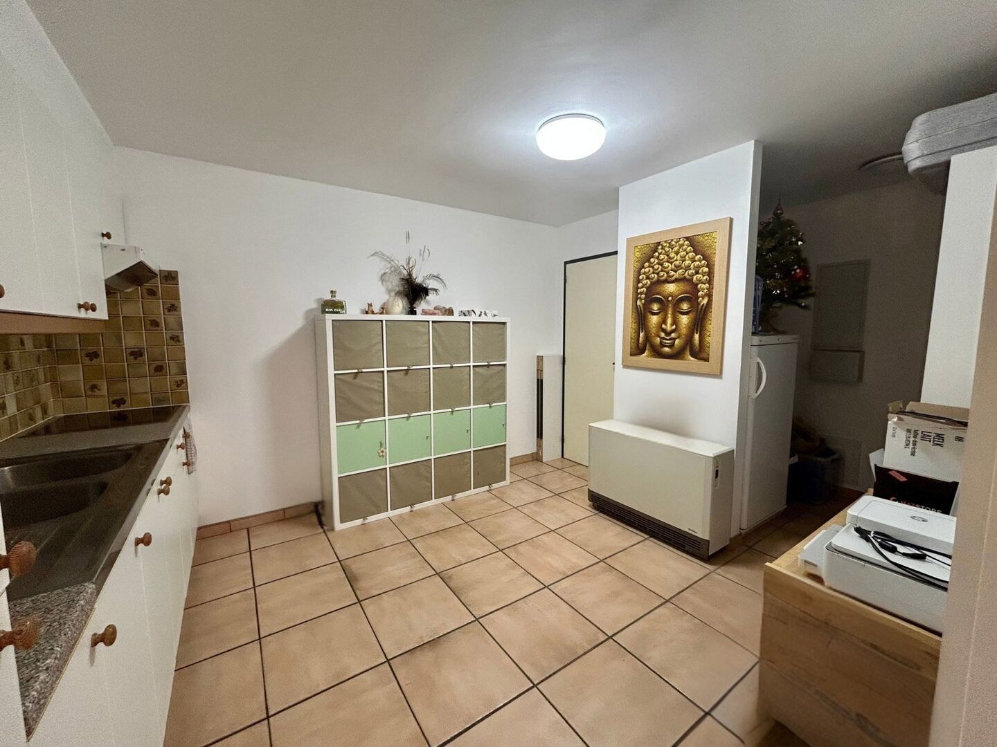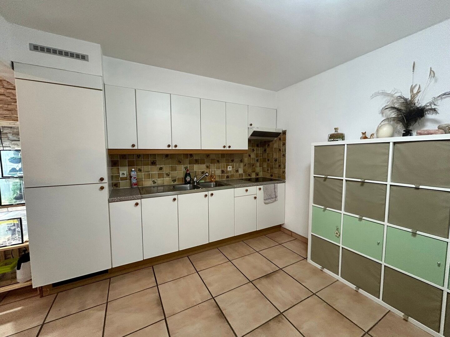 een inkomhal, een aangename woonkamer met veel lichtinval, een praktische keuken uitgerust met koelkast, kookplaat, dampkap en dubbele lavabo. In de keuken is bovendien extra ruimte voorzien voor een bijkomende koelkast, diepvriezer of extra opbergruimte.