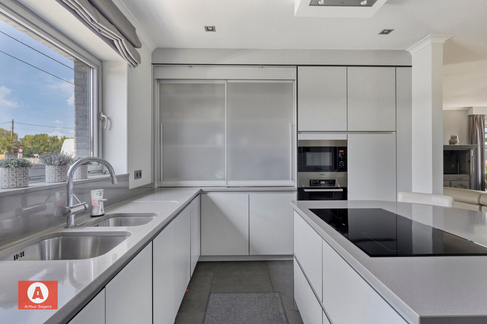 De woning beschikt over een inkomhal, lichtrijke leefruimte met zicht op de tuin, volledig uitgeruste keuken met Miele-toestellen, garage en praktische berg-/wasplaats met doorgang naar de werkplaats. Boven: nachthal met ingebouwde kasten, masterbedroom met dressing, doorloopkamer (bureau), derde slaapkamer en badkamer.