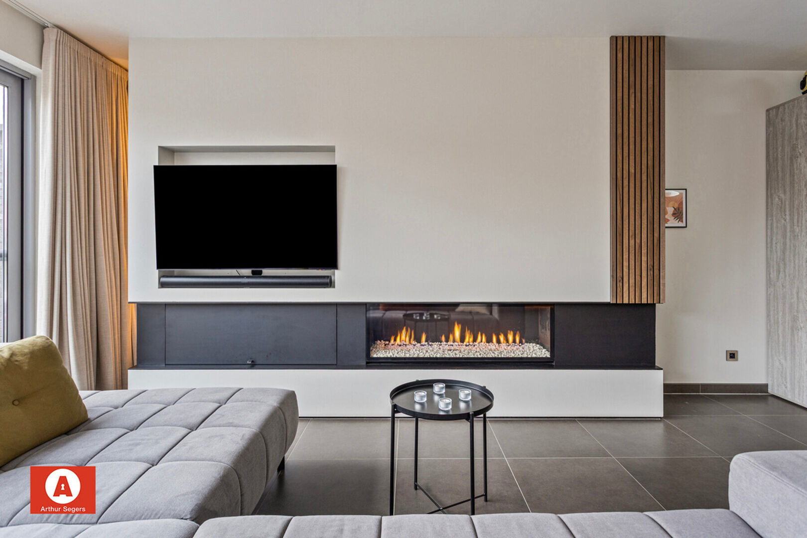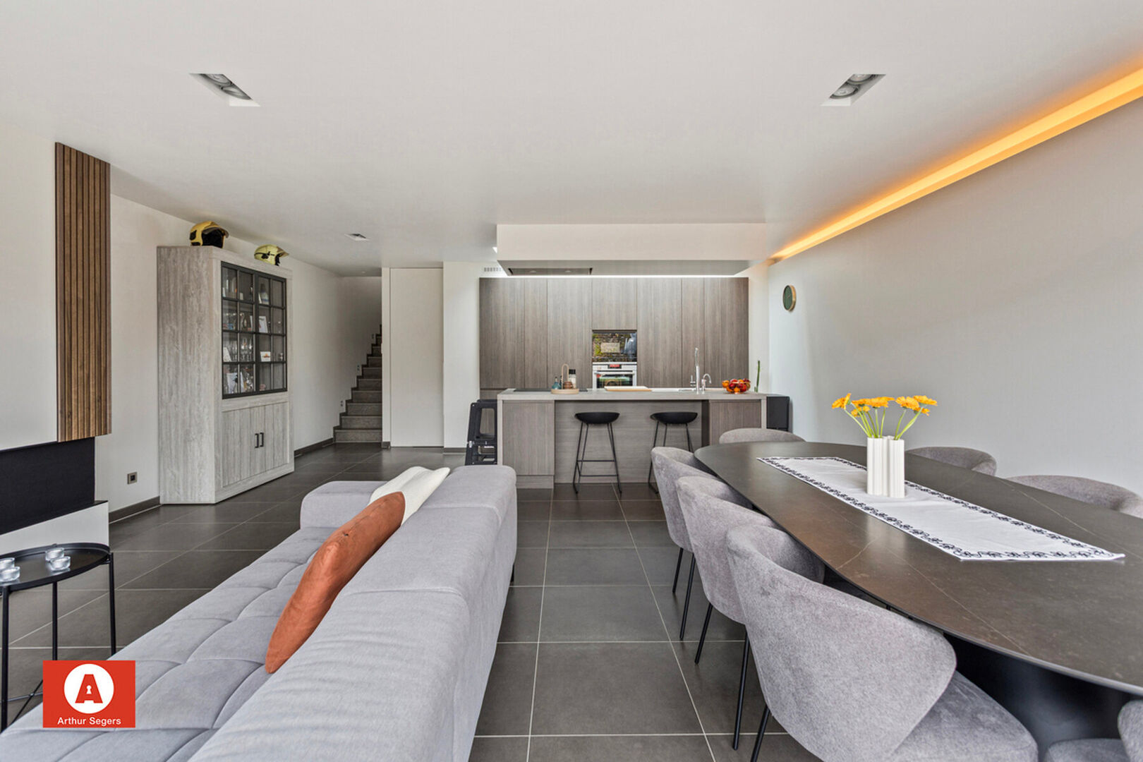 Op het gelijkvloers is er de inkomhal, leefruimte (incl. maatmeubel & gashaard) met aansluitend de keuken, berging/wasplaats, inpandige garage en het gastentoilet terug te vinden.